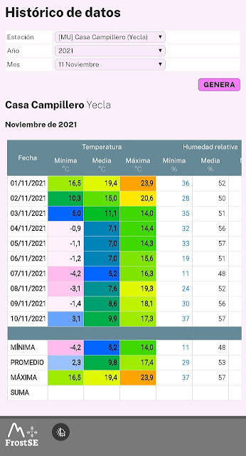 ¡¡ Además podrás saber a qué hora se han registrado sus extremos (máximos y mínimos) diarios en cada una de sus variables !!: